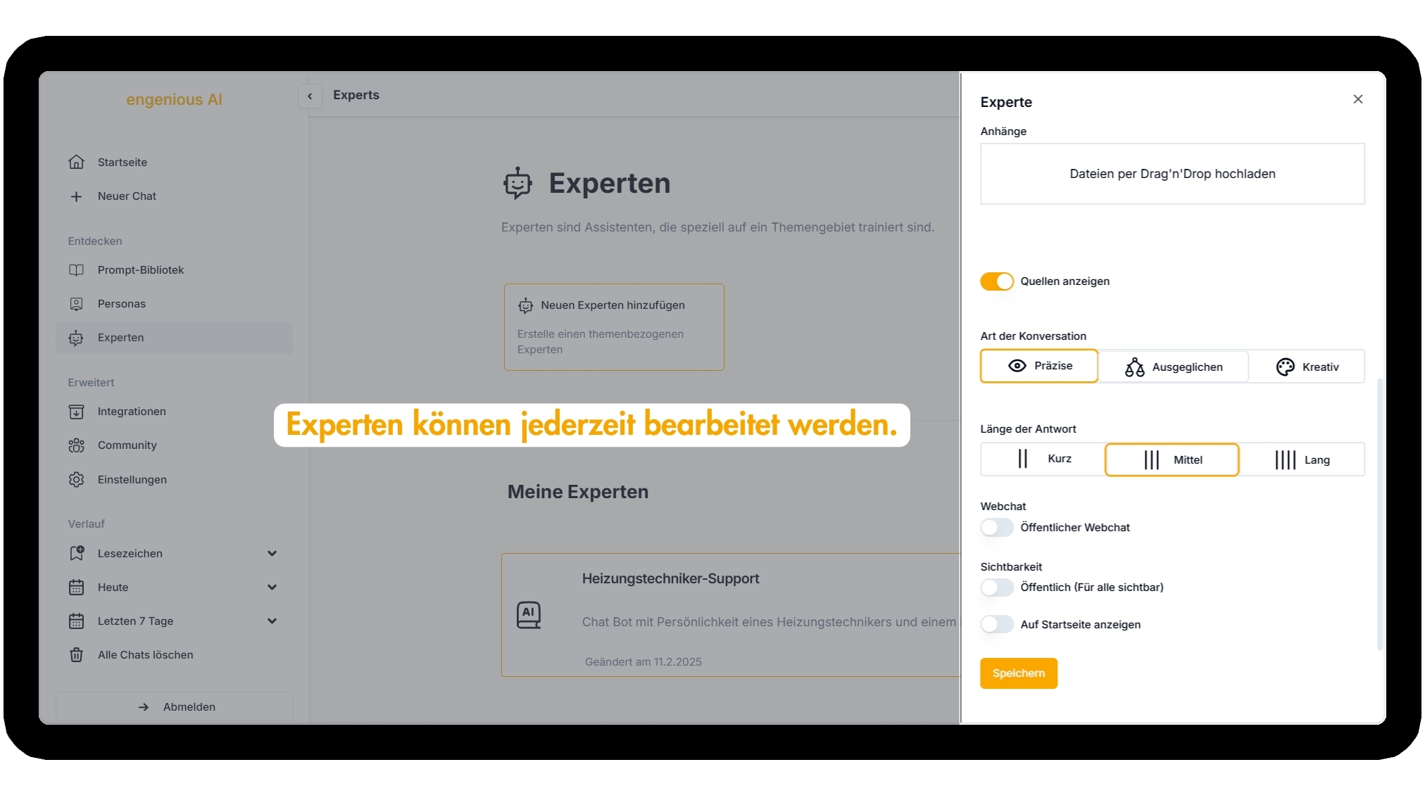 - Erweitere Deine Experten um relevantes Wissen in Form Deiner Dokumente und Daten